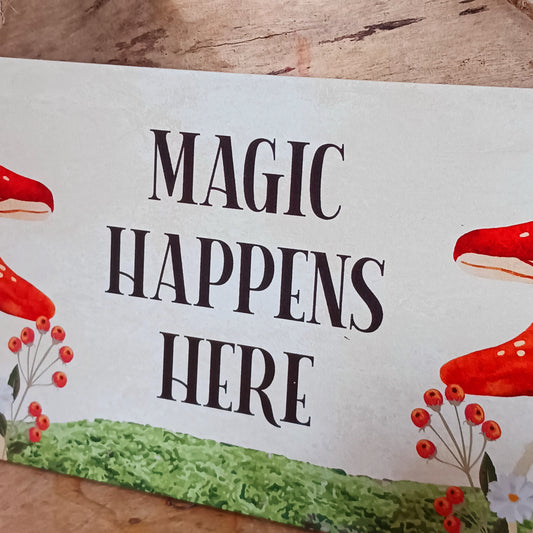 Magic Happens Here Mushroom Hanging Sign