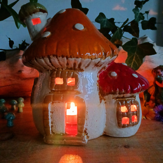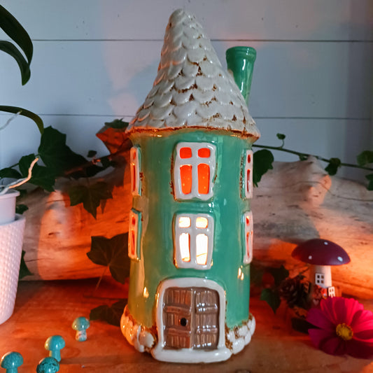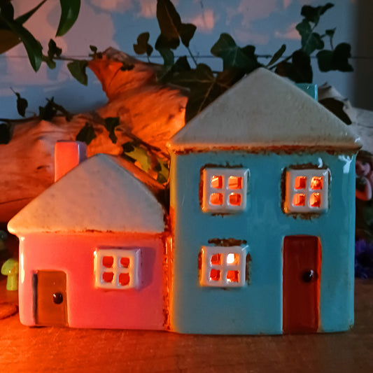 Village Pottery Pink & Aqua Two Houses Tealight Holder