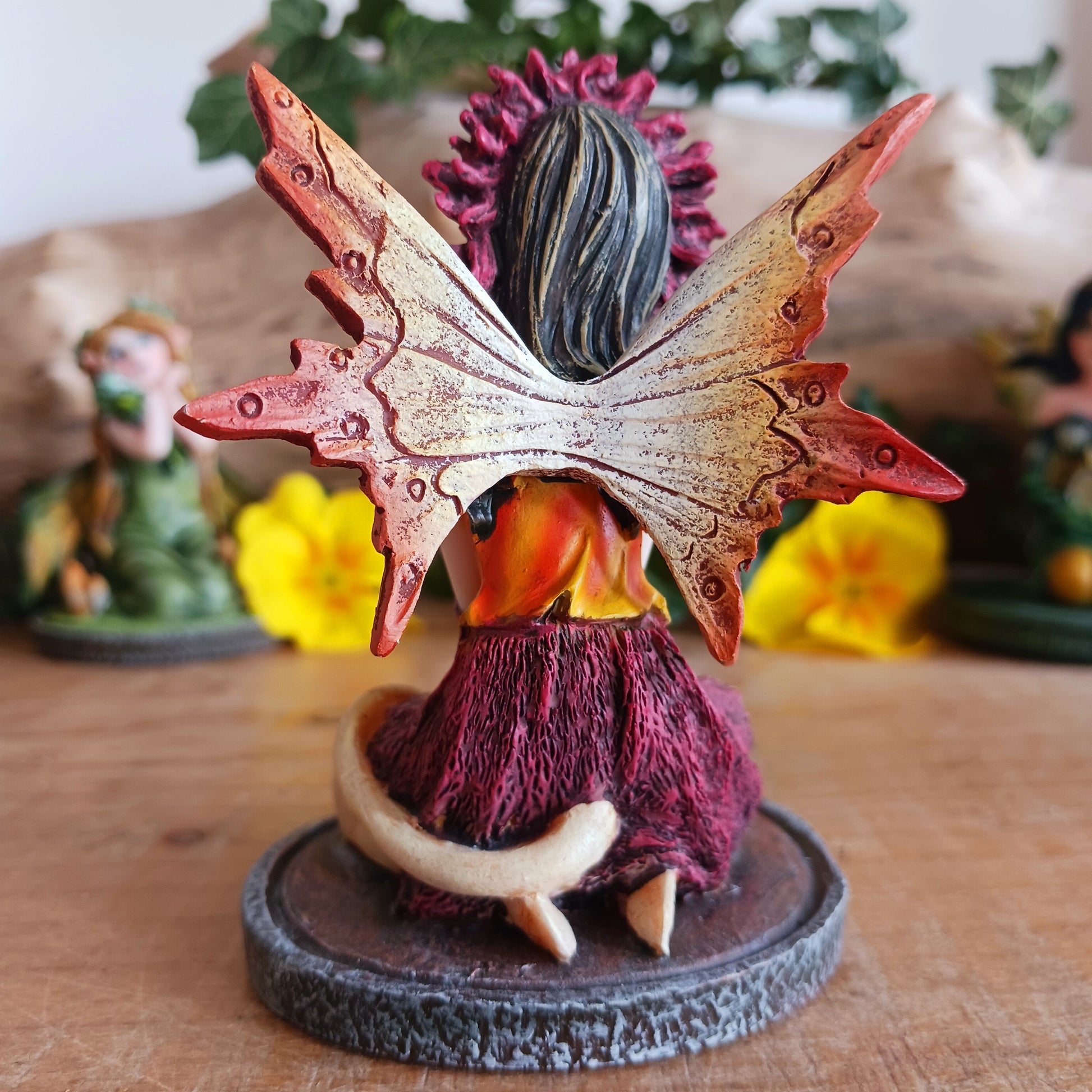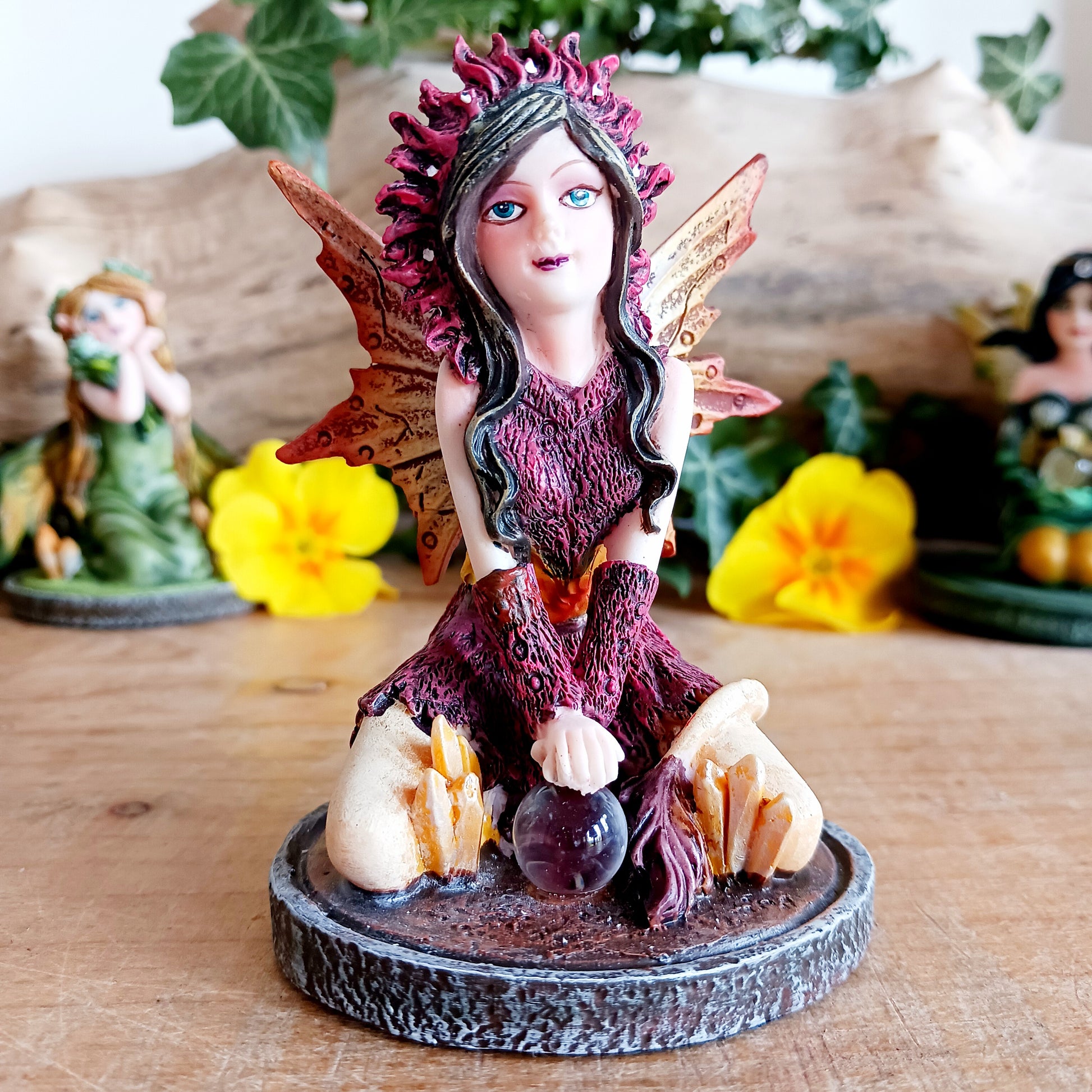 Meet Poppy, a captivating fairy figurine perched forward on her knees, hands resting delicately on a glass ball adorned with crystals. Her design, featuring vibrant orange and red hues and intricate wings, resonates with natural beauty.