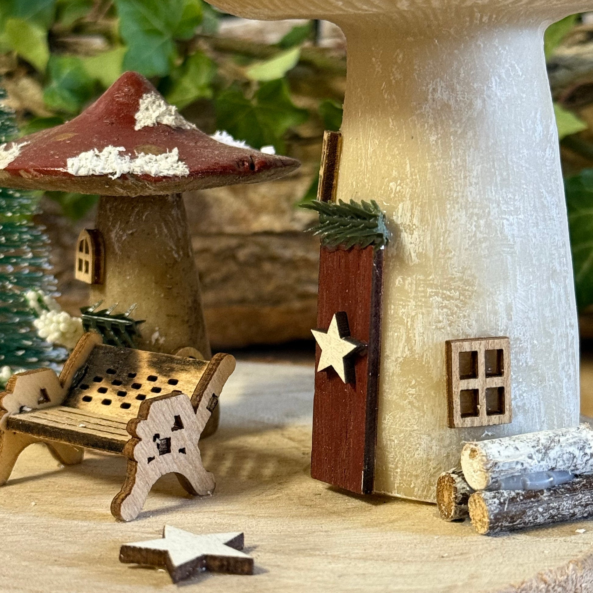 These twin toadstool houses create the feel of a tiny winter village where fairies gather, lanterns glow, and woodland creatures wander between snow-dusted doors. Perfect for festive shelves, fairy gardens, or cosy cottagecore décor throughout the Yuletide season.